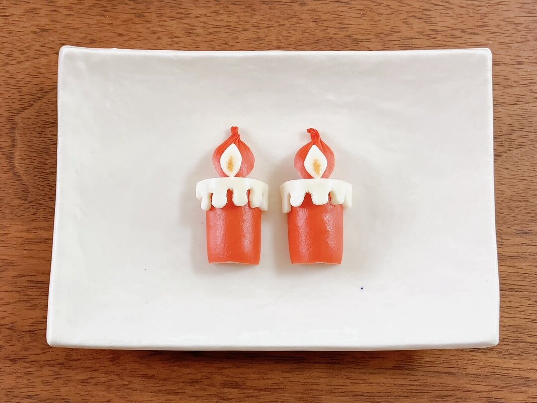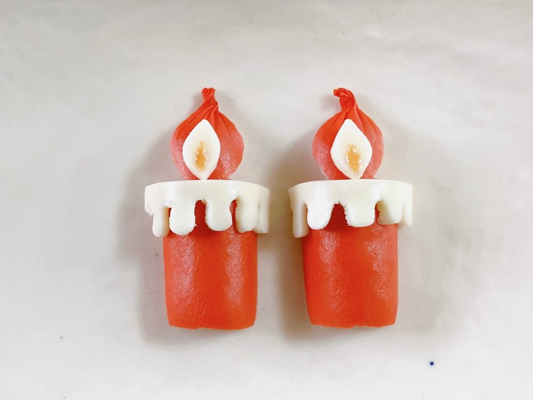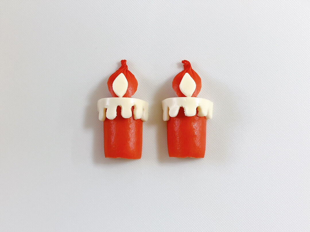 次はウインナーとスライスチーズで作るろうそく。ウインナーの端のねじられた部分が炎の先にぴったり!1本のウインナーで2つのろうそくができます。チーズを切るのには爪楊枝を使います。