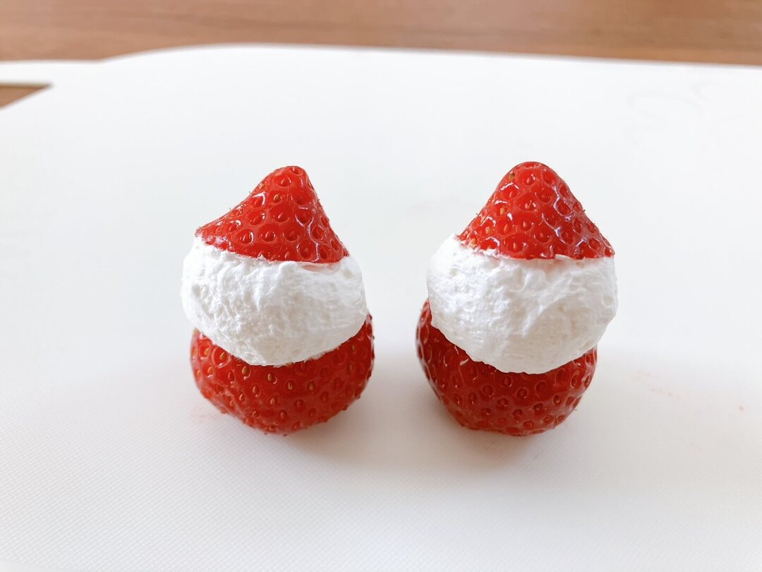 クリームの上に切ったいちごの先端をのせて帽子にします。てっぺんにも生クリームを少しのせて帽子のポンポンに!
