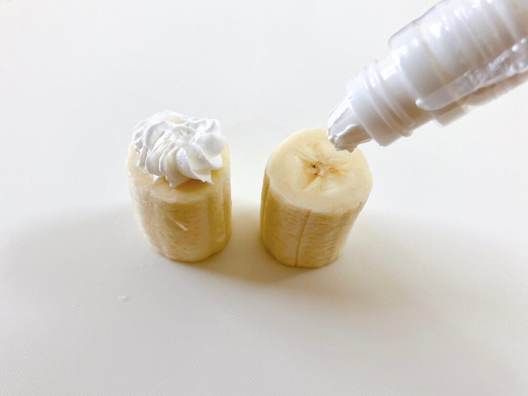 サンタの顔を作ります。バナナの下の部分に生クリームを絞ってヒゲをつけ、いちごの鼻、チョコペンで目をつけたら完成です!