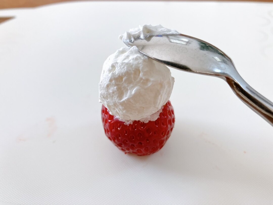 しっかり泡立てた生クリームをいちごの上にぷっくりとのせます。
