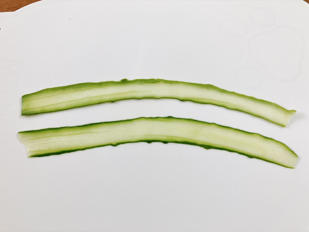 その後、ピーラーで縦に薄くスライスしたリボン状のきゅうりを作ります。