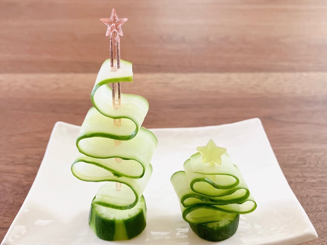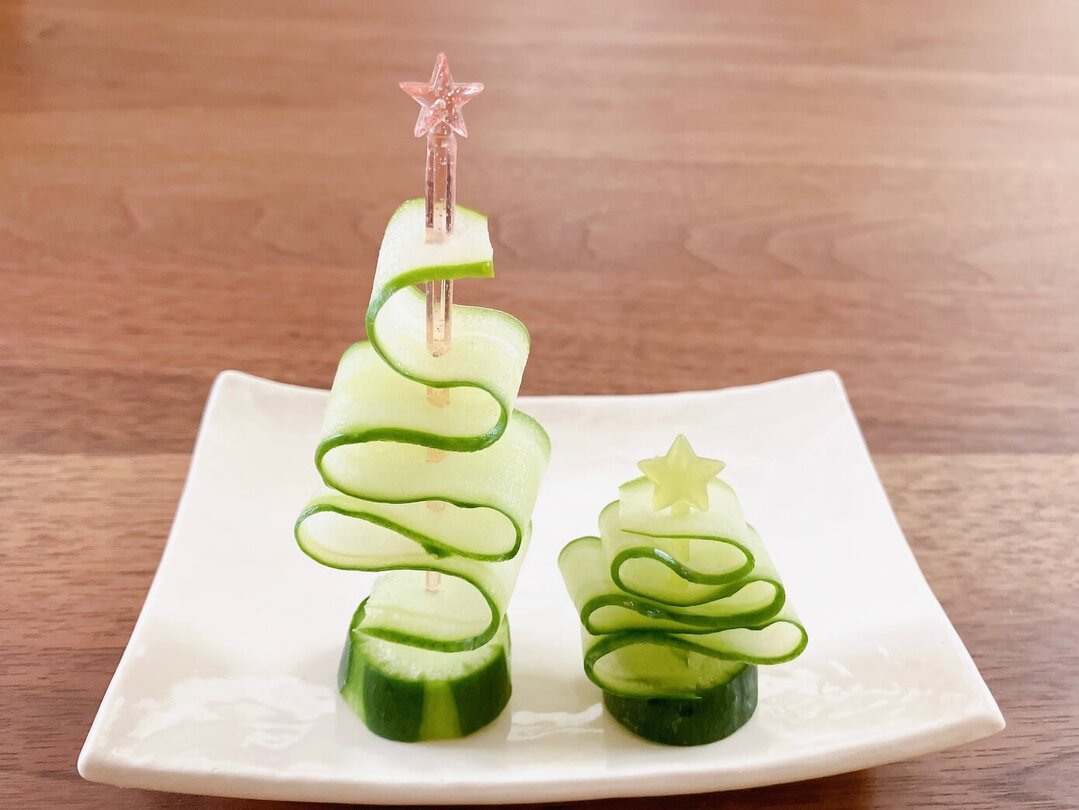 こちらもサラダや前菜にぴったりのきゅうりで作るクリスマスツリー。ピーラーでリボン状にしたきゅうりを留めるだけと簡単!