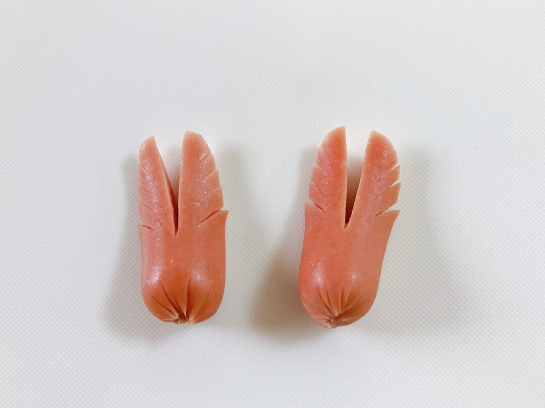 赤ウインナーは先に茹でておきます。片方の端を切り落とし、縦半分に切ります。