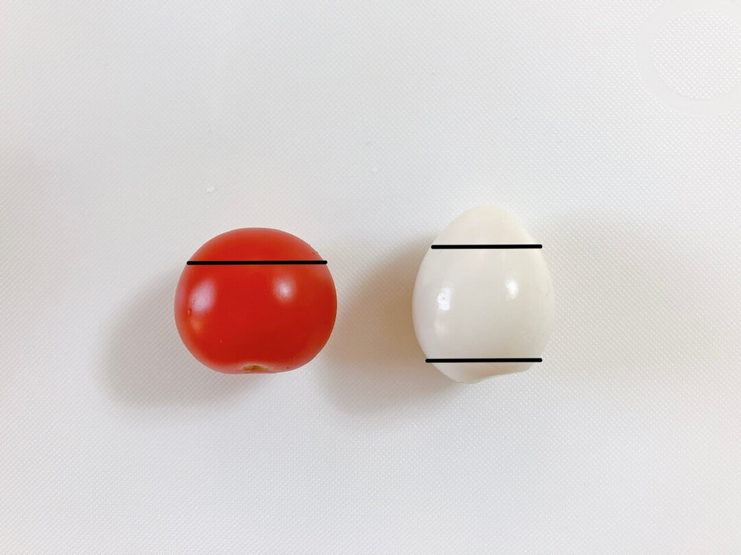 ミニトマトはへた側でない端を、うずらの卵は両端を切ります。