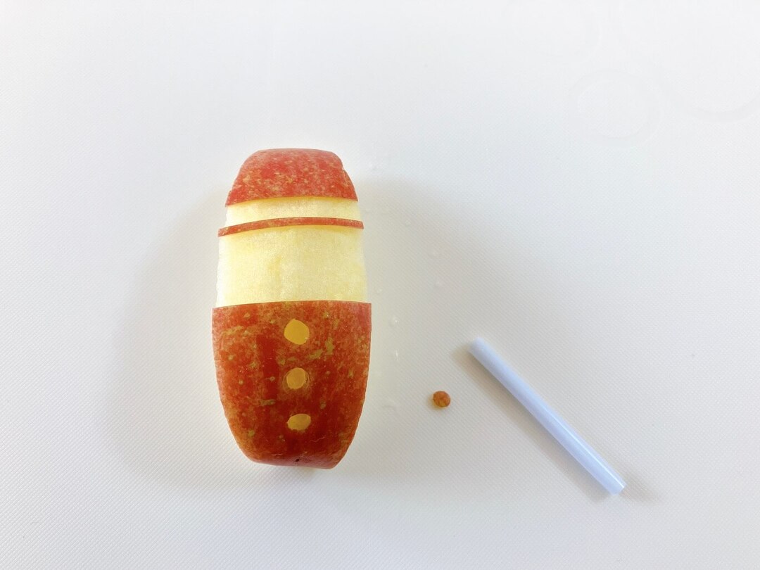 服のボタンになる部分の皮を丸く取り除きます。スティック型の抜き型があれば使い、なければストローでも代用できます。抜いた丸い皮の1つは鼻にします。