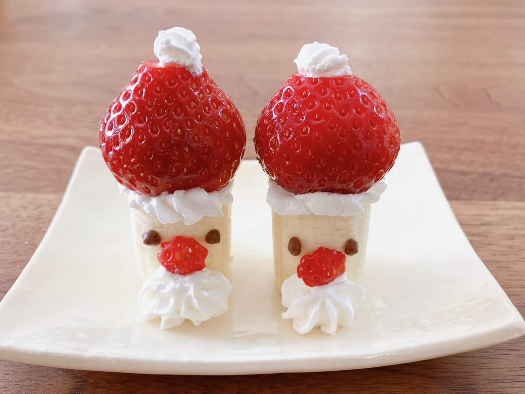 バナナといちごで作るおちゃめなサンタクロースの顔。いちごの先端をつかった赤いお鼻がポイントです。簡単にできて存在感たっぷりのアイデア!