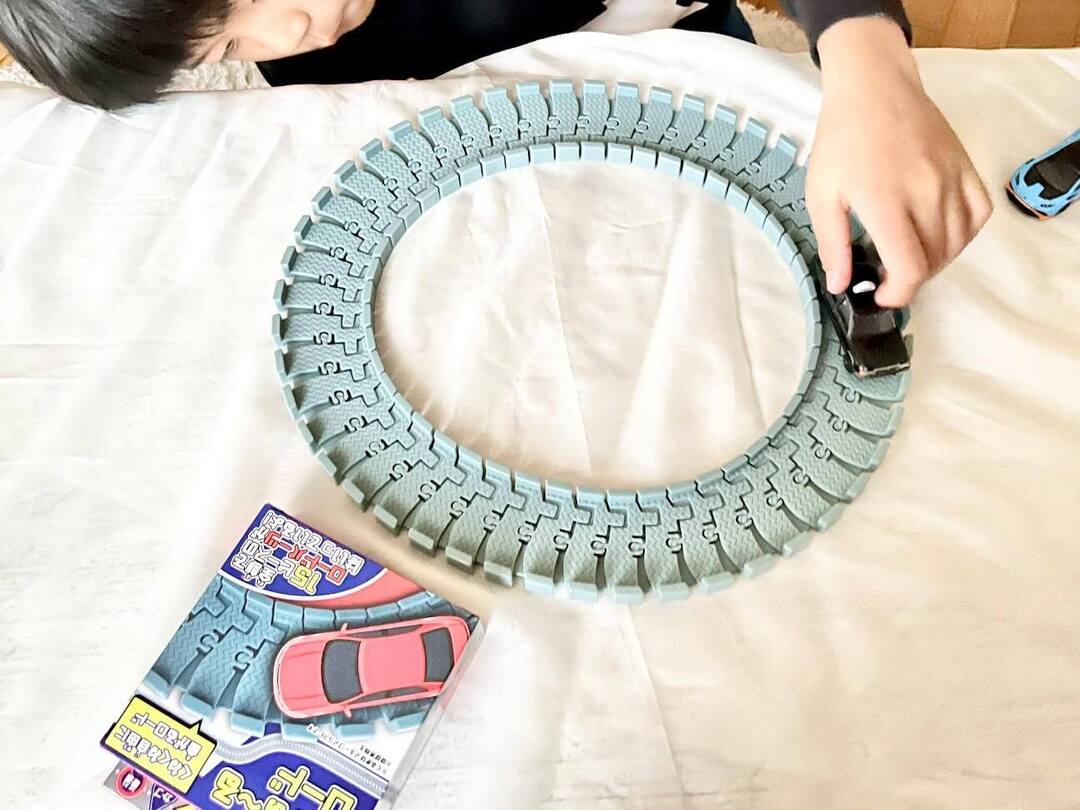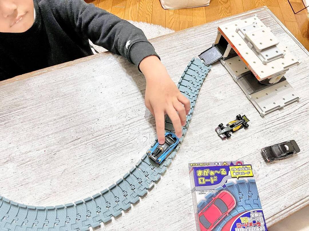「まがぁ~るロード」のコース幅は、トミカを走らせるのにちょうどいいサイズ。息子はまずは、まっすぐな道を作って車を走らせた後、カーブや円形の道路を作って楽しんでいました。よっぽど楽しかったのか、かなり集中して1時間程度無言で没頭していました。