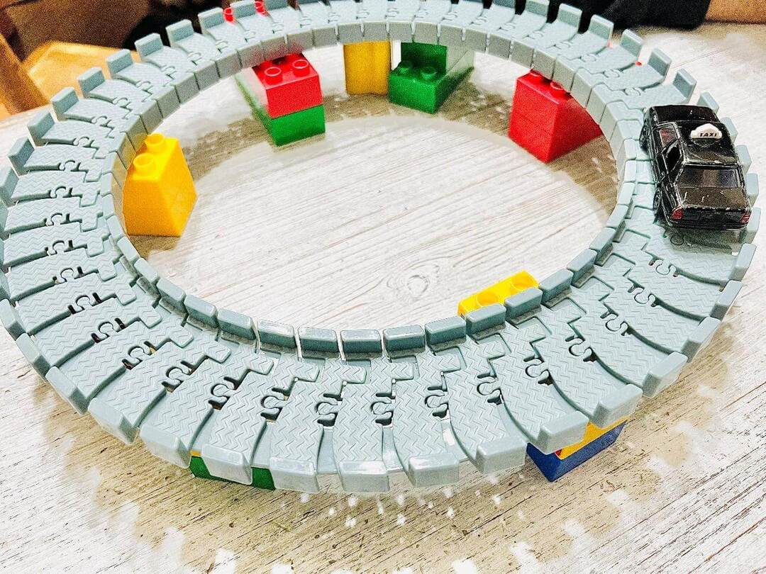 ほかにも、道路をブロックで高さを出し、高速道路も作成していました。アイデア次第で何通りもの道路を作って遊べそうです。なんといっても1箱100円なので、少しずつ追加して遊びの幅を広げようと思います!