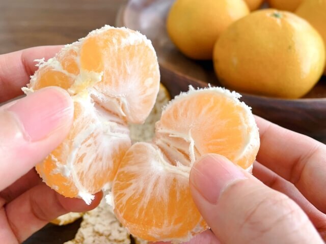 白い部分には水溶性の食物繊維も豊富です。実だけを食べた時と比べると4倍多く摂れるといわれているので便秘解消にもおすすめ。ついつい食べ過ぎてしまう冬にもぴったりなんです。