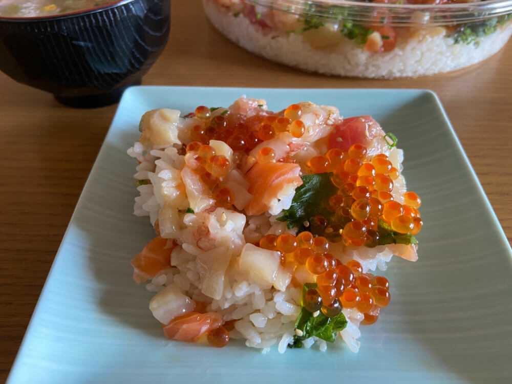 サイズは大きいですが平たい容器なので酢飯の量が多すぎて酢飯だけ余る!という心配もなくちょうどいいバランスで食べ進めることができるのもうれしいポイントです。