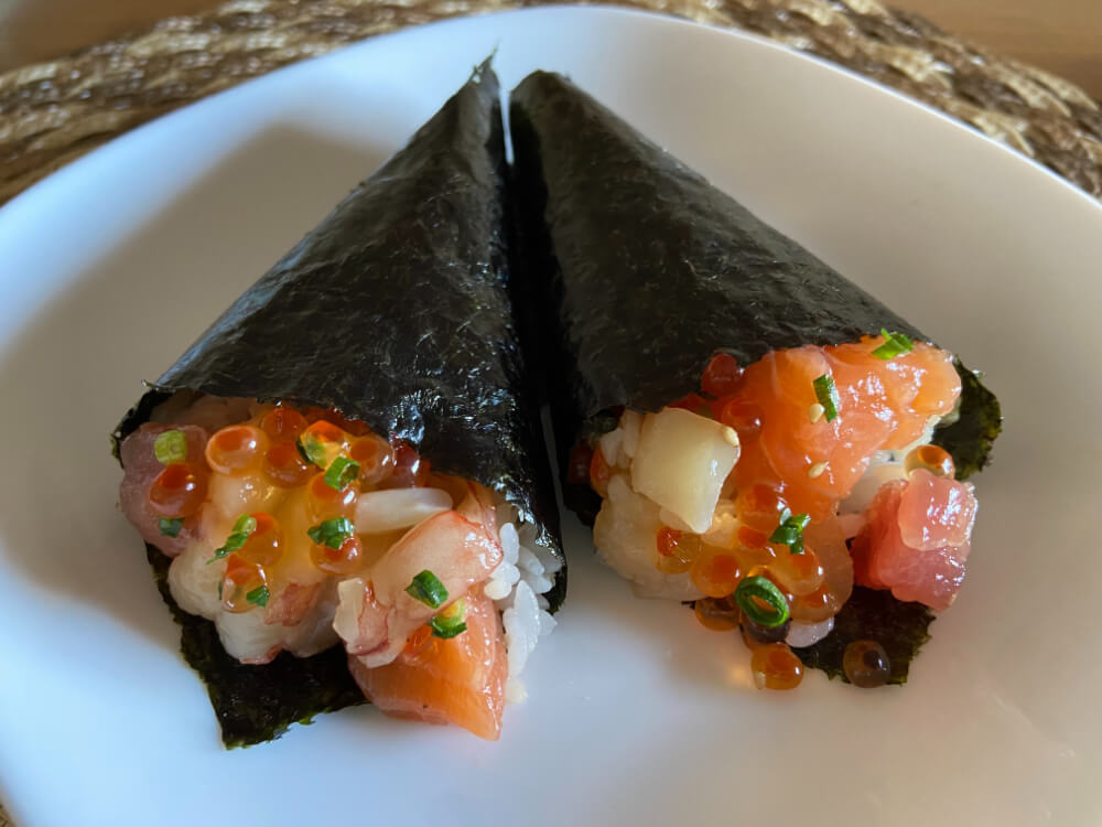 つづいても手軽でおいしいアレンジを。手巻き寿司にすれば手で持って食べやすく、海鮮と海苔のおいしい組み合わせで、子どもたちも大喜び。