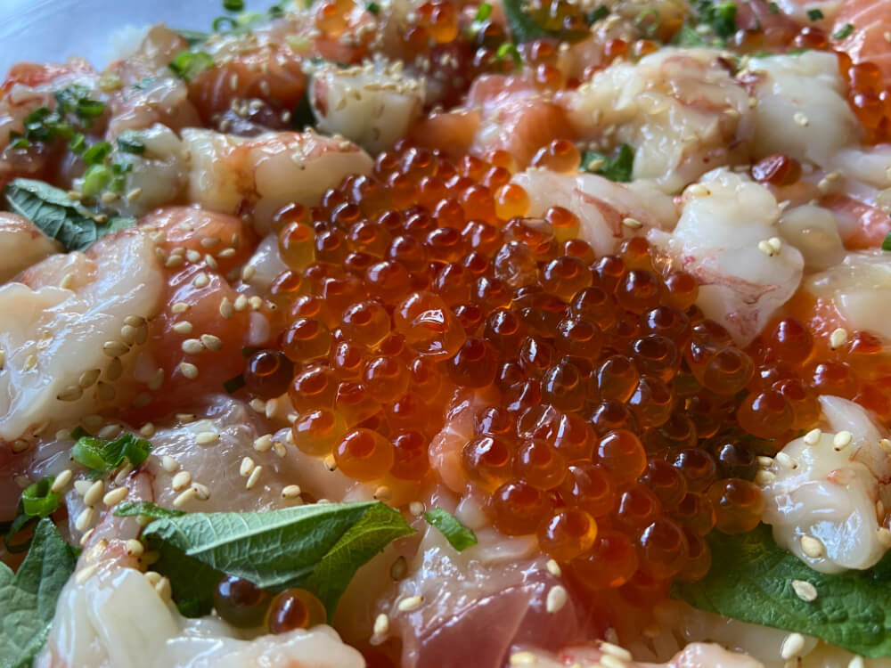 いか、サーモン、まぐろ、えび、真鯛、いくら醤油漬けの6種の海鮮がのって、さらに青ねぎ、ごま、大葉がトッピングされています。