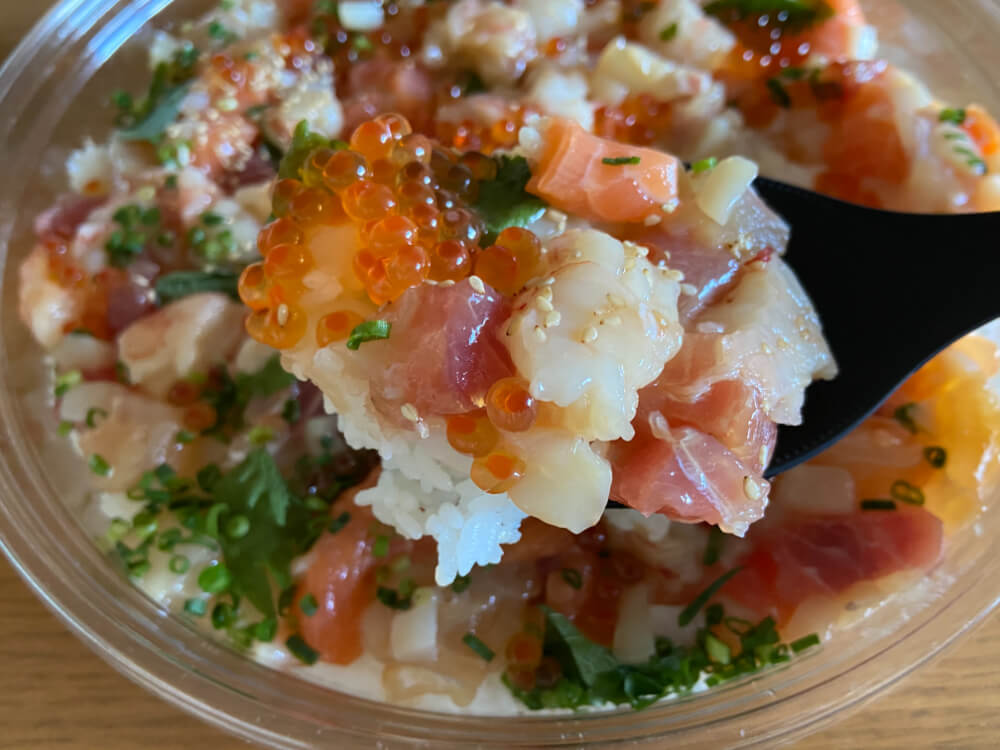 真鯛はさっぱりとして上品な味わいで、イカは細かくカットされていますがコリっと存在感のある食感。そこにいくら醤油漬けがぷちっと弾けてたまらないおいしさ!