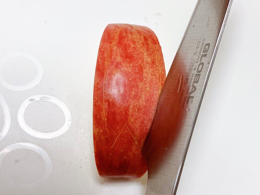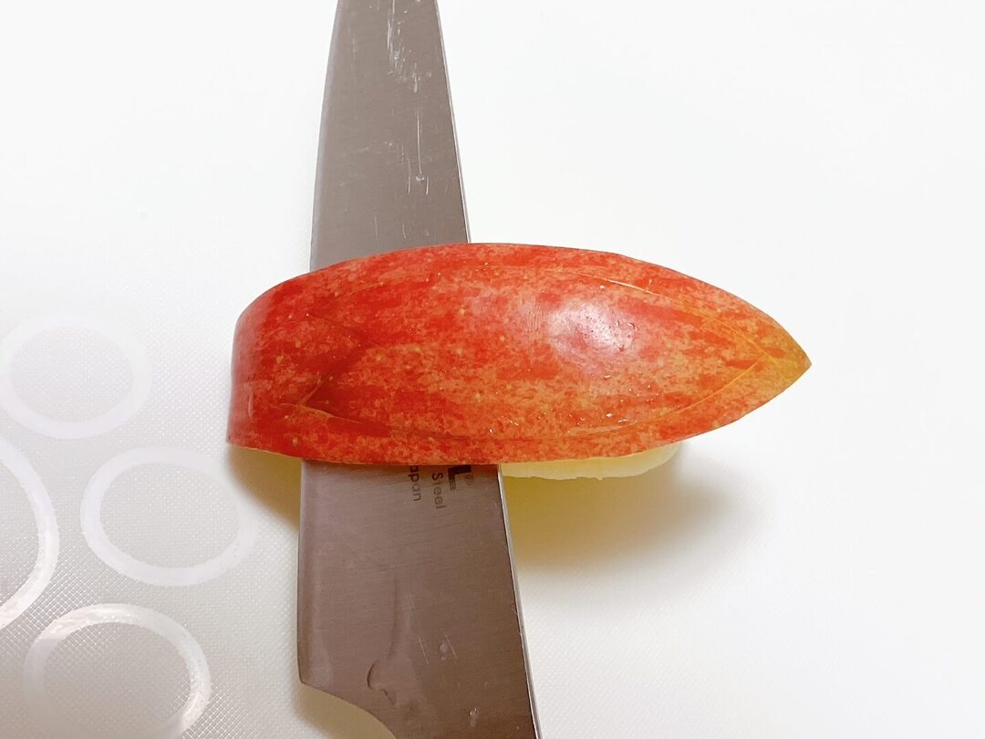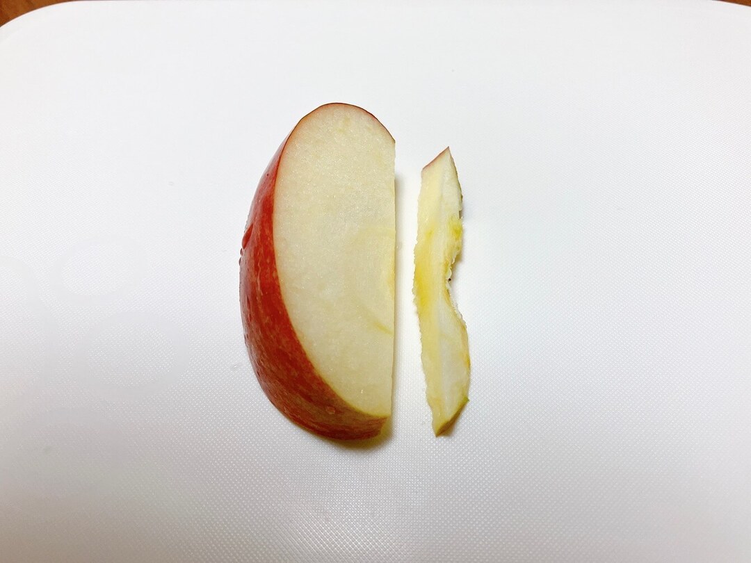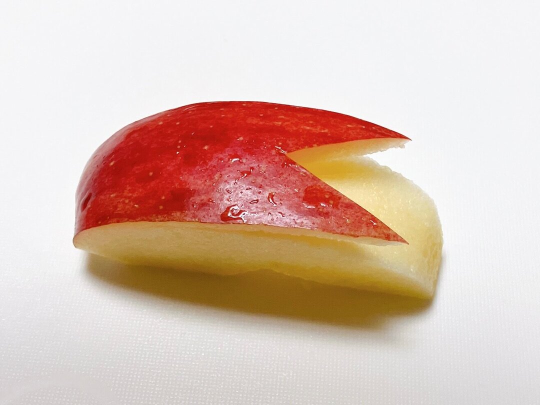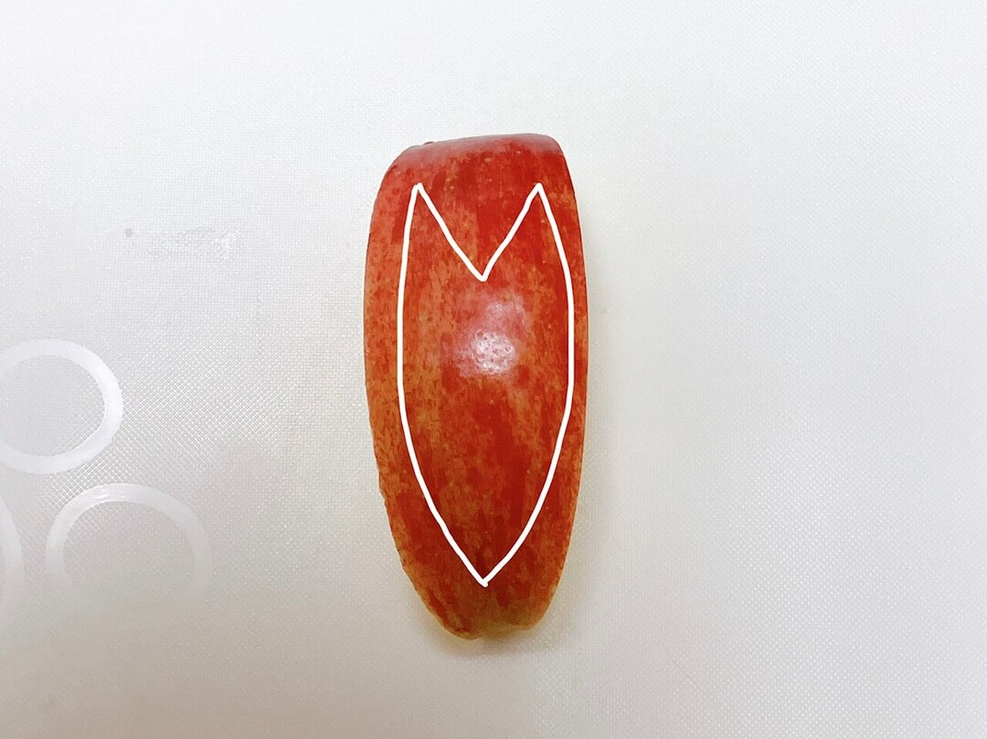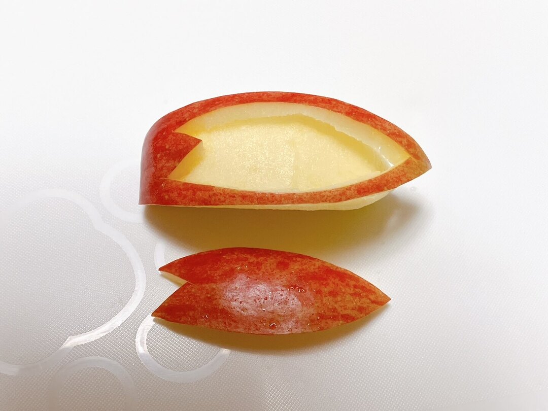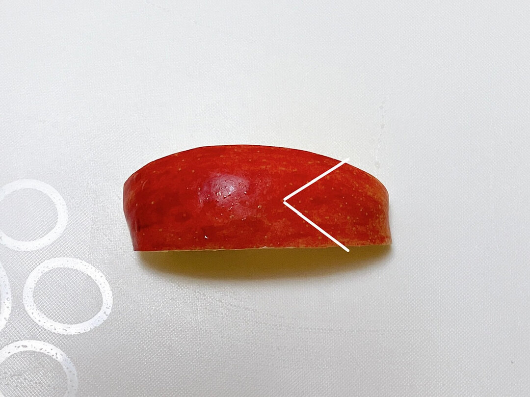 りんごを8等分に切り、芯を切り落とします。皮にV字に切り込みを入れ、切り込みの先あたりまで少し厚めに皮をむきます。V字の角度はお好みで。