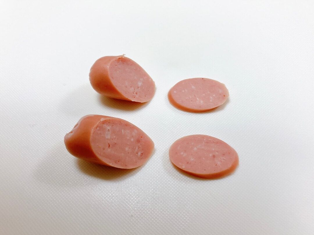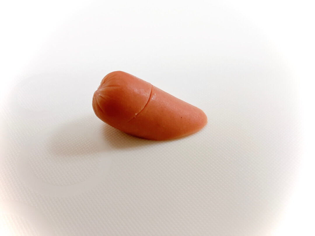 皮なしウインナーを茹でて斜め半分に切り、切り口を1ミリくらい薄く切り落とします。