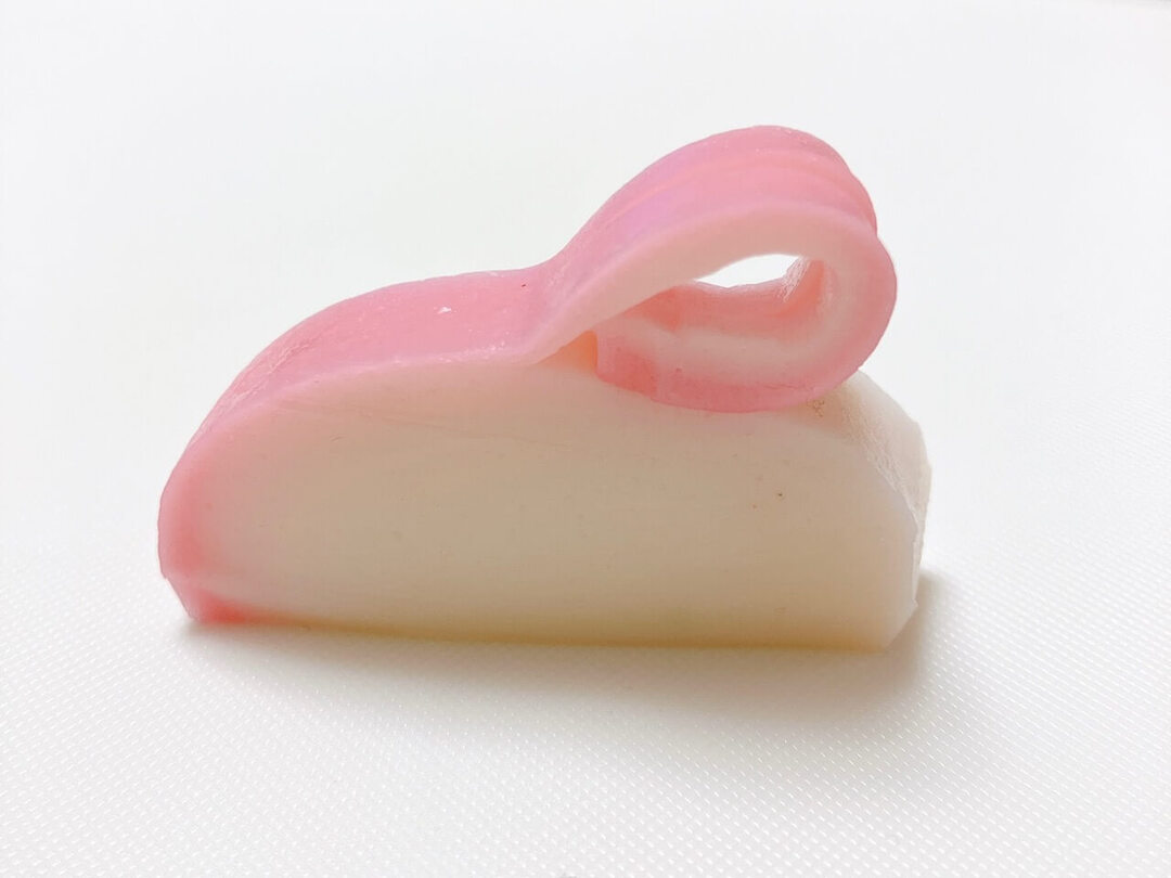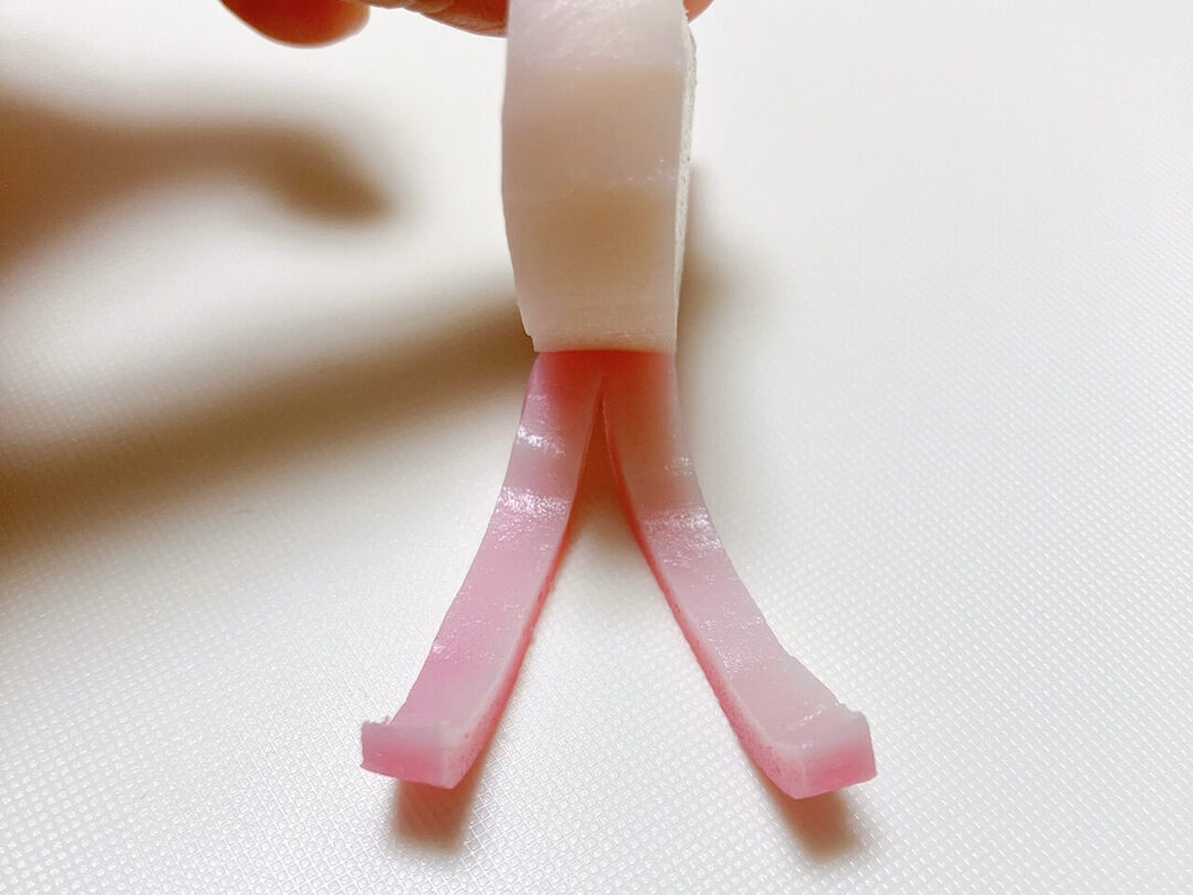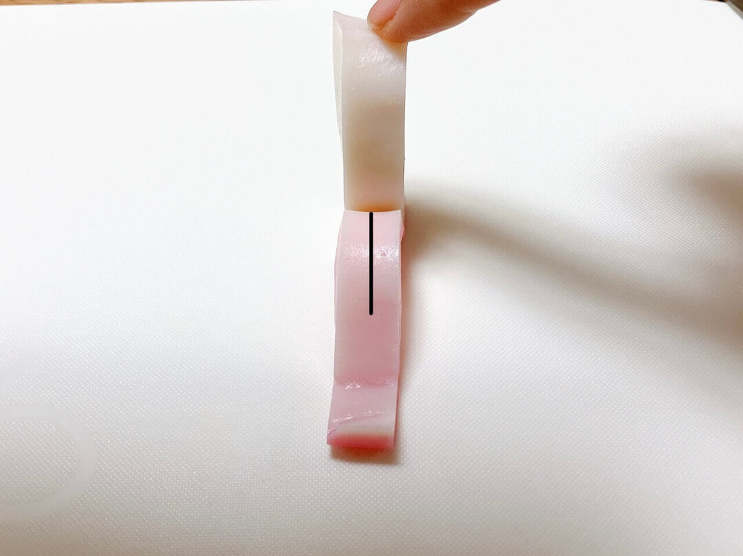 かまぼこを1センチ幅に切り、ピンク色の下側を2/3まで切り込みを入れます。白い部分も少し入るように厚めに切るときれいに仕上がりますよ。