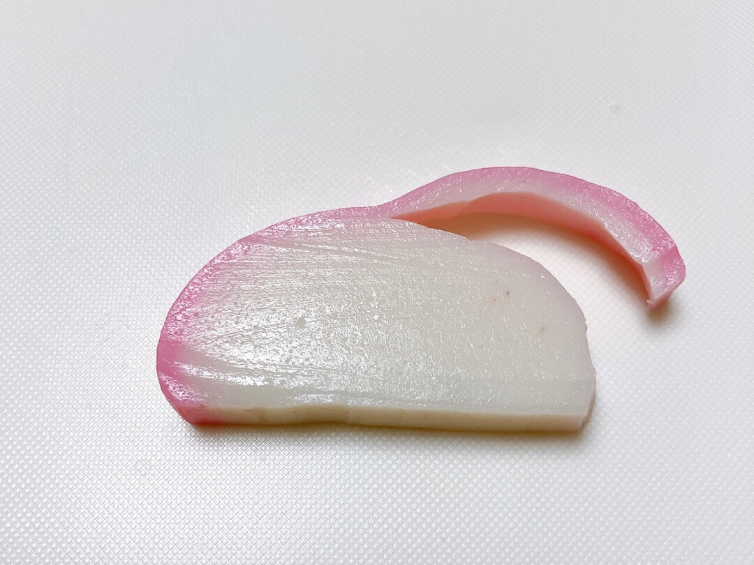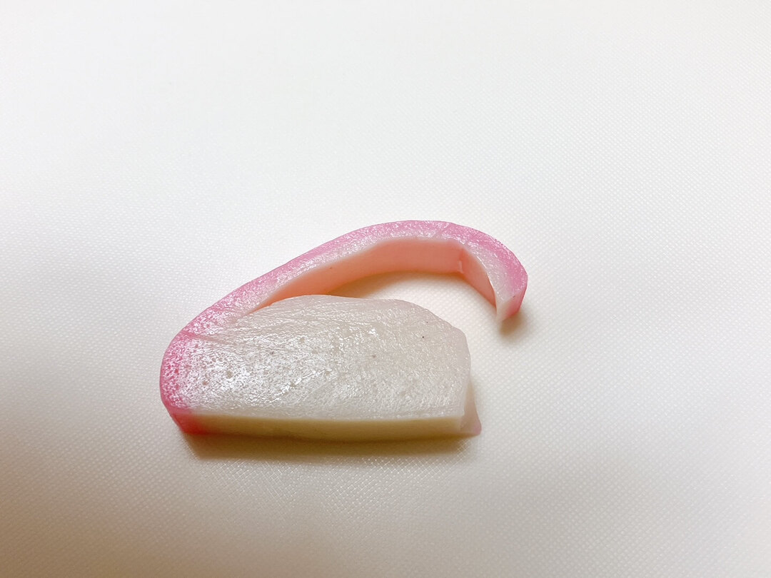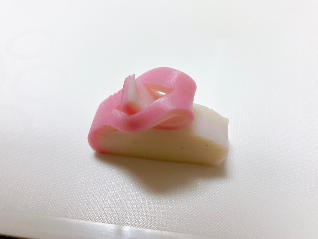 かまぼこを1センチ幅に切り、ピンク色の下側を真ん中まで切り込みを入れます。