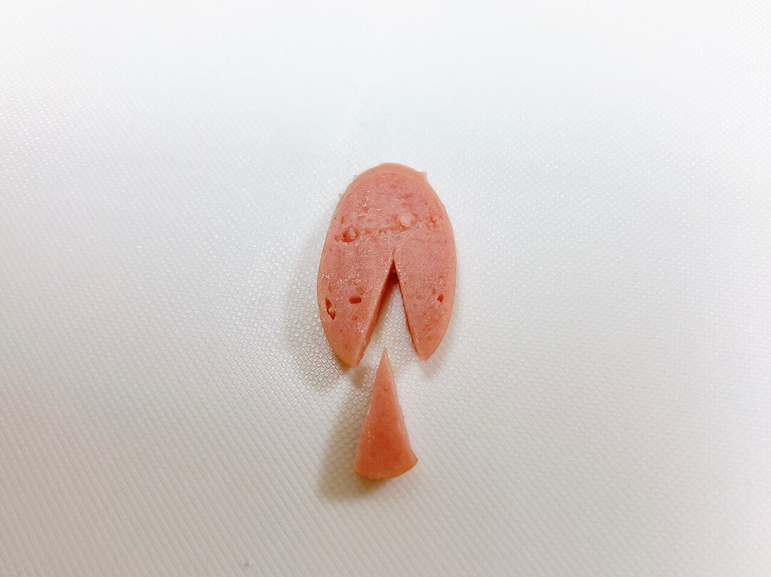 薄く切ったウインナーに切り込みを入れ、耳にします。