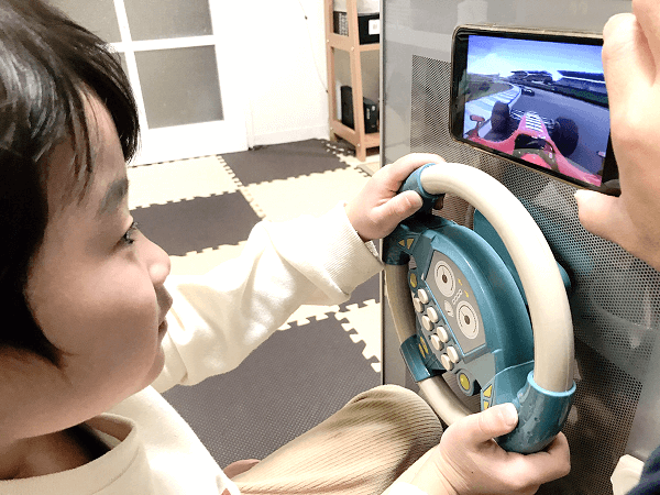 「すご~い!ハンドルがクルクル回る!」と喜ぶ息子。ハンドル型のおもちゃは可動域が狭いものもありますが、スリコのハンドルおもちゃはなんと360°回転!子どもが元気よくクルクルとハンドルを回すことができるのです。
