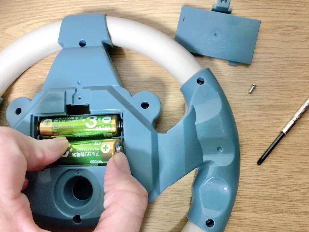 音が鳴る仕様ということもあり、単三乾電池を2本用意する必要があります。ドライバーを使って電池ふたを開けて入れます。