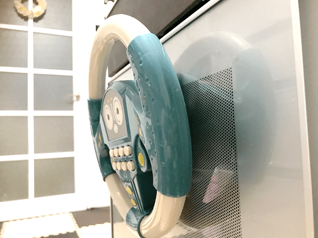 このハンドルおもちゃの特徴は、ハンドル背面に吸盤がついていること。せっかくなのでおうちの中で貼りつけられる場所を探してみました。