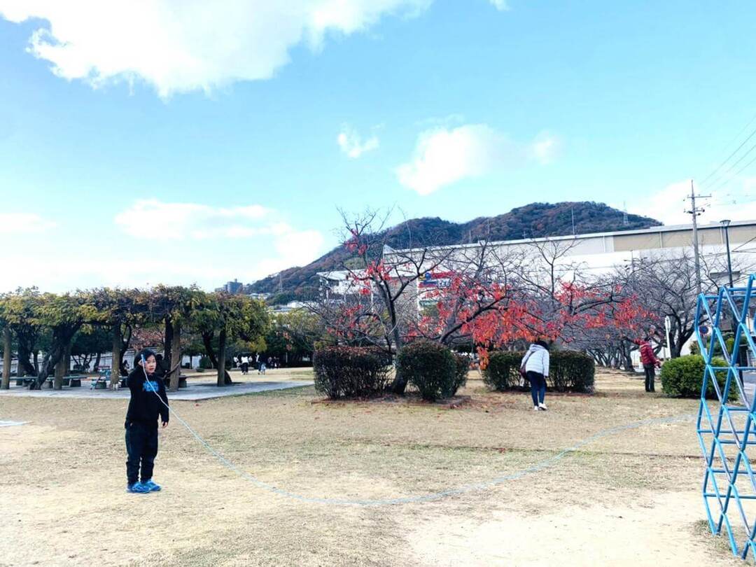 息子によれば、公園で大縄跳びを回してくれる人が見つからない…なんてときには、写真のように遊具に片方を結びつけて回せるそう。