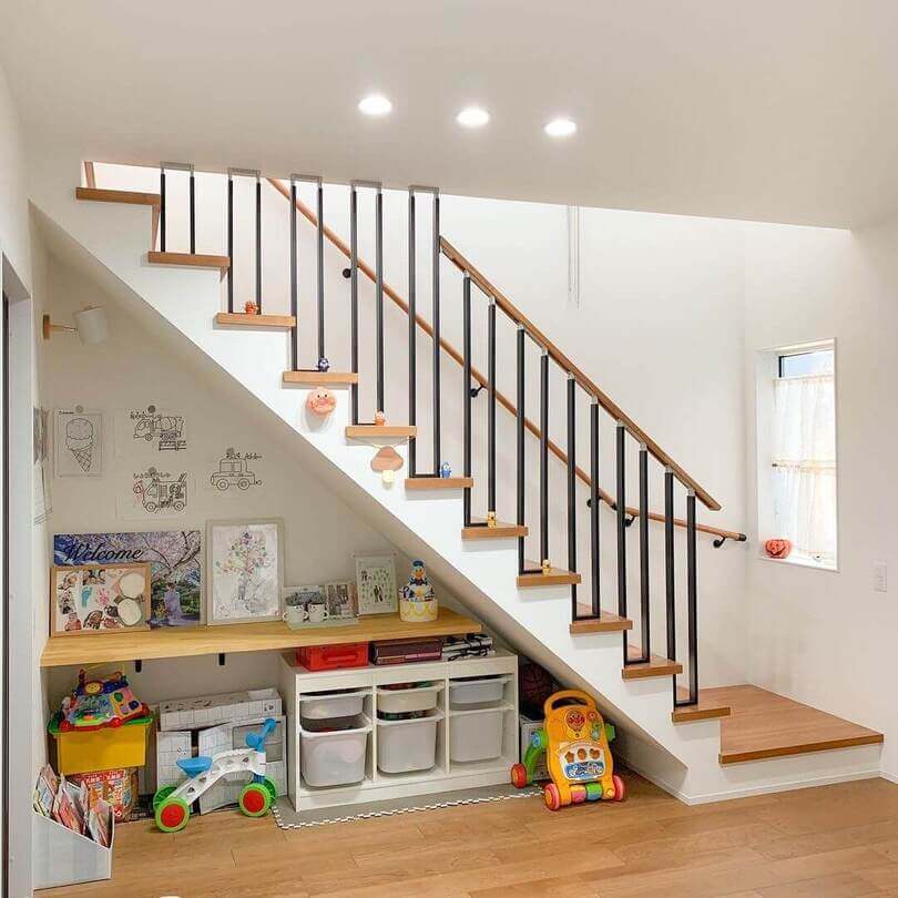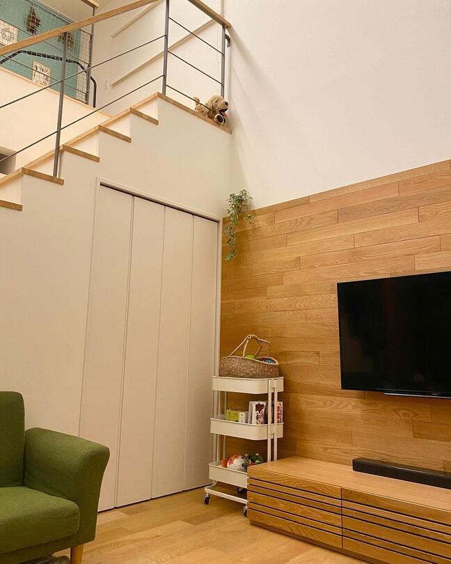 大きなおもちゃも階段下のスペースに収まっていれば、リビングはすっきり片づいて見えますね。