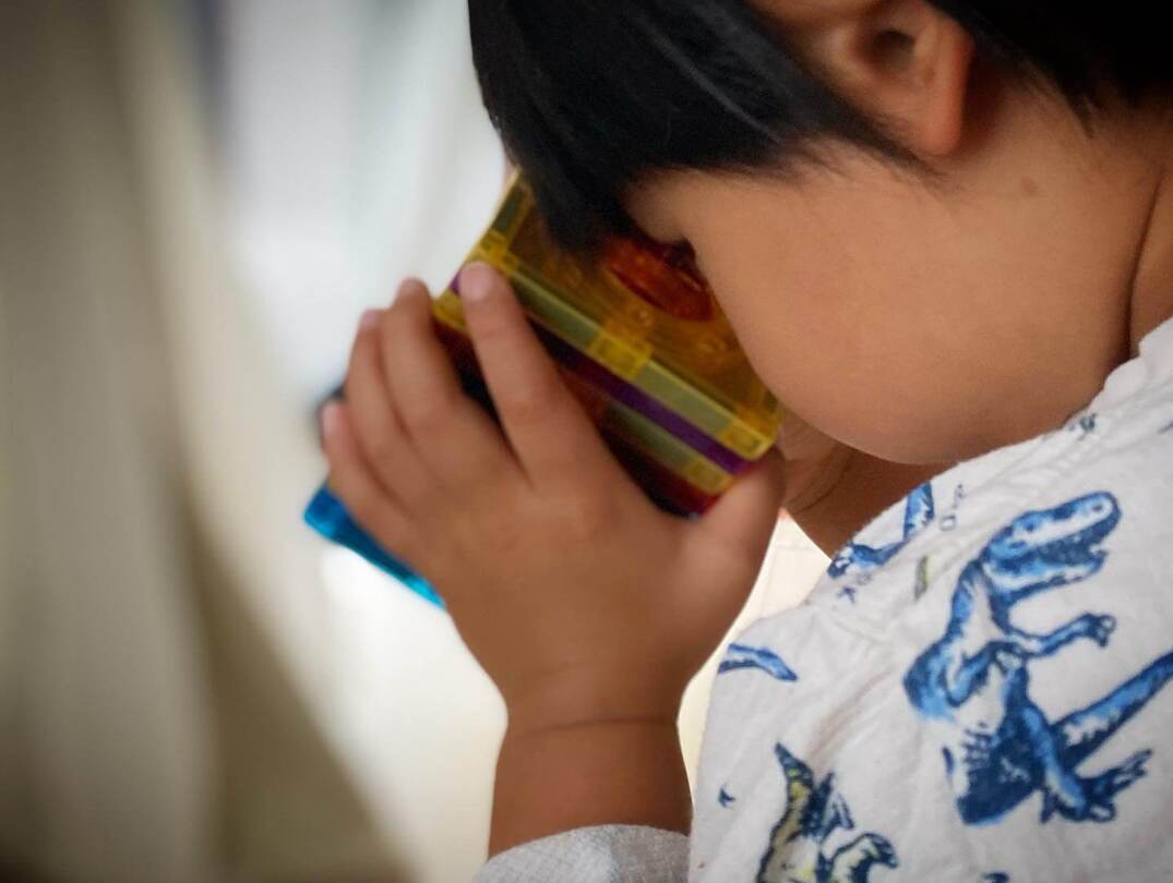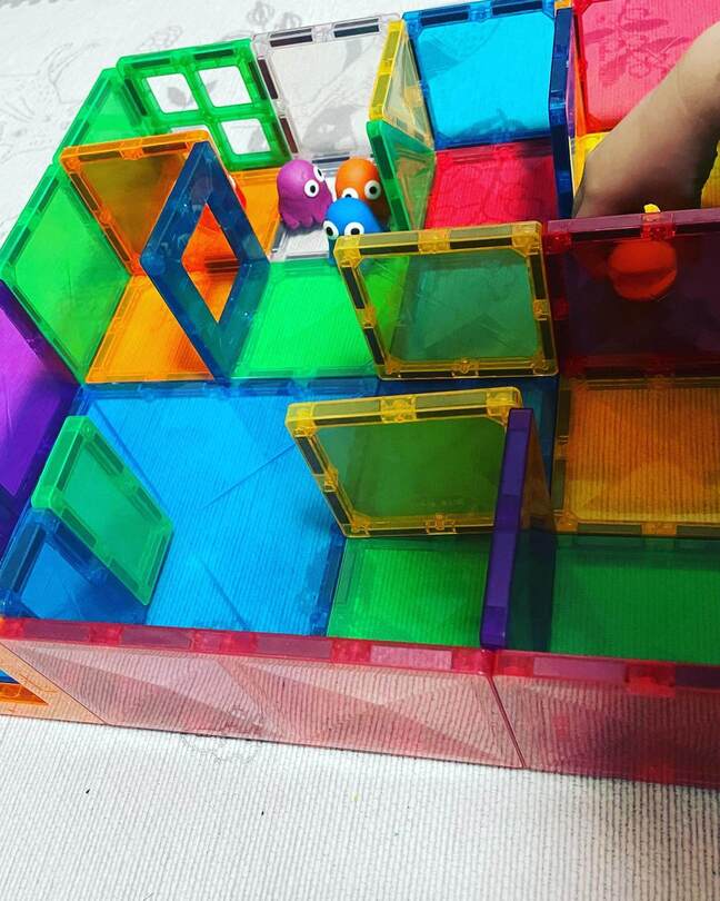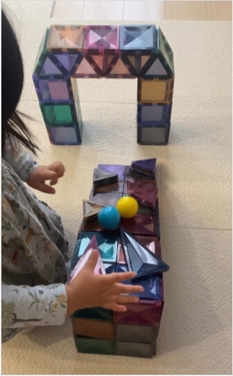 マグビルドのパネルはたくさん重ねることができます。み~もさんのお子さんは、穴あきのパネルパーツを連ねてトンネル遊び。
