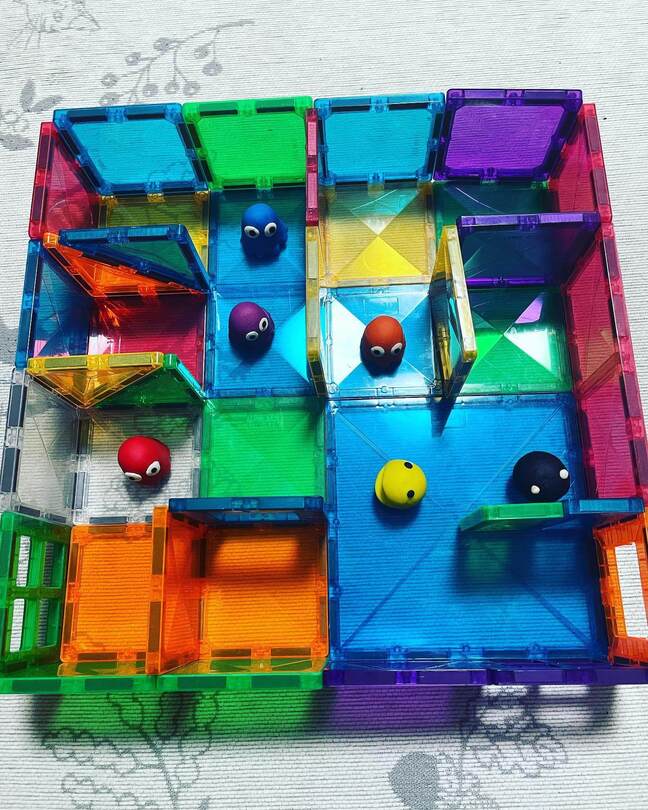 なかでも編集部がおもしろい!と思ったのは、マグビルドの迷路の中で粘土で作ったパックマンで遊ぶ「パックマンごっこ」。マグネットパネルなら迷路作りも自由自在ですね。
