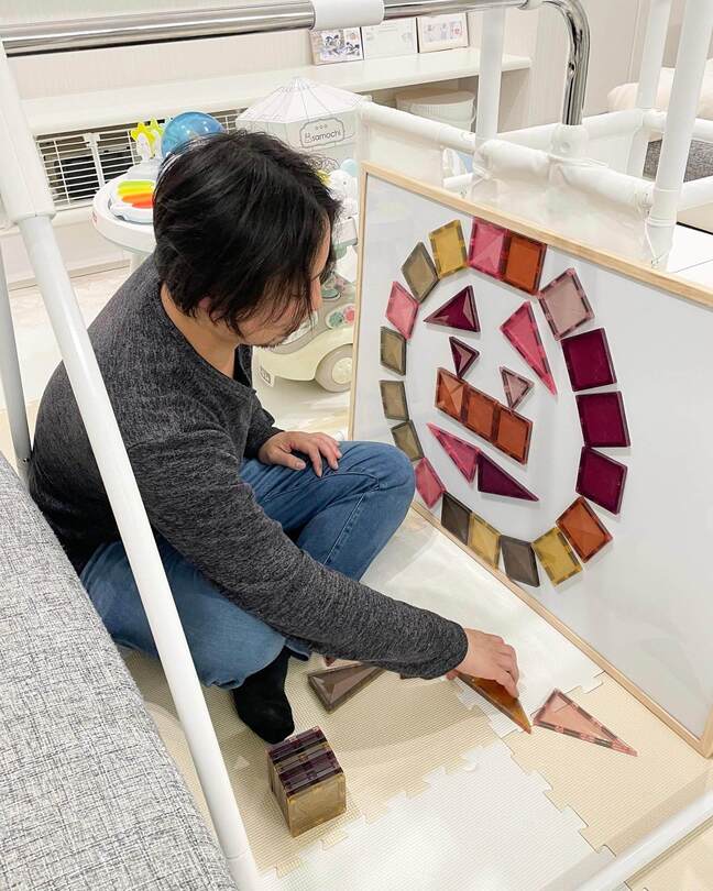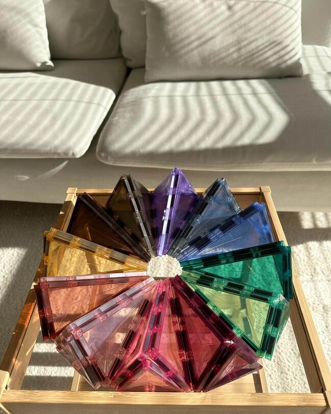 光がたっぷり入るお部屋で遊ぶとステンドグラスのよう!色ごとにパネルを積みあげたお城は、床にも反射していつまでも眺めていられそうな美しさです。