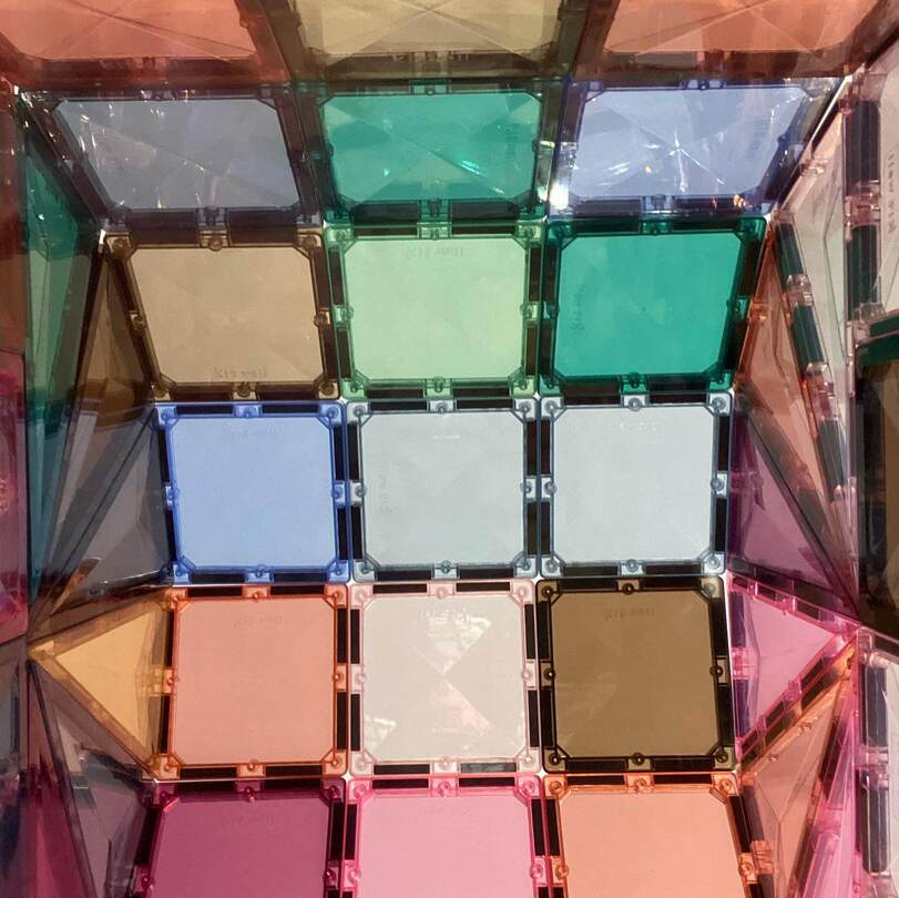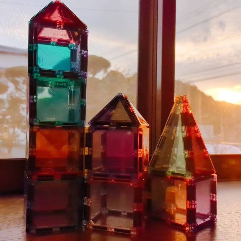 そんな知育メリットに加えて、マグビルドが人気を集める理由のひとつに"パネルの透過性"があります。光をきれいに反射させる「ダイヤモンドカットデザイン」が施されていて、ライトを入れて光らせたり、朝日や夕日に照らされた作品がとってもキレイ!SNSでも話題になっています。