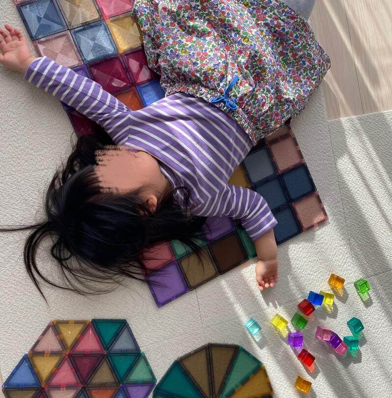 こちらは「マグビルド カラーズ」で作ったカラフルなカーペット。発案から作成まで2歳の娘さんが1人で行ったそうです。完成して気持ちよさそうにゴロ~ン♡