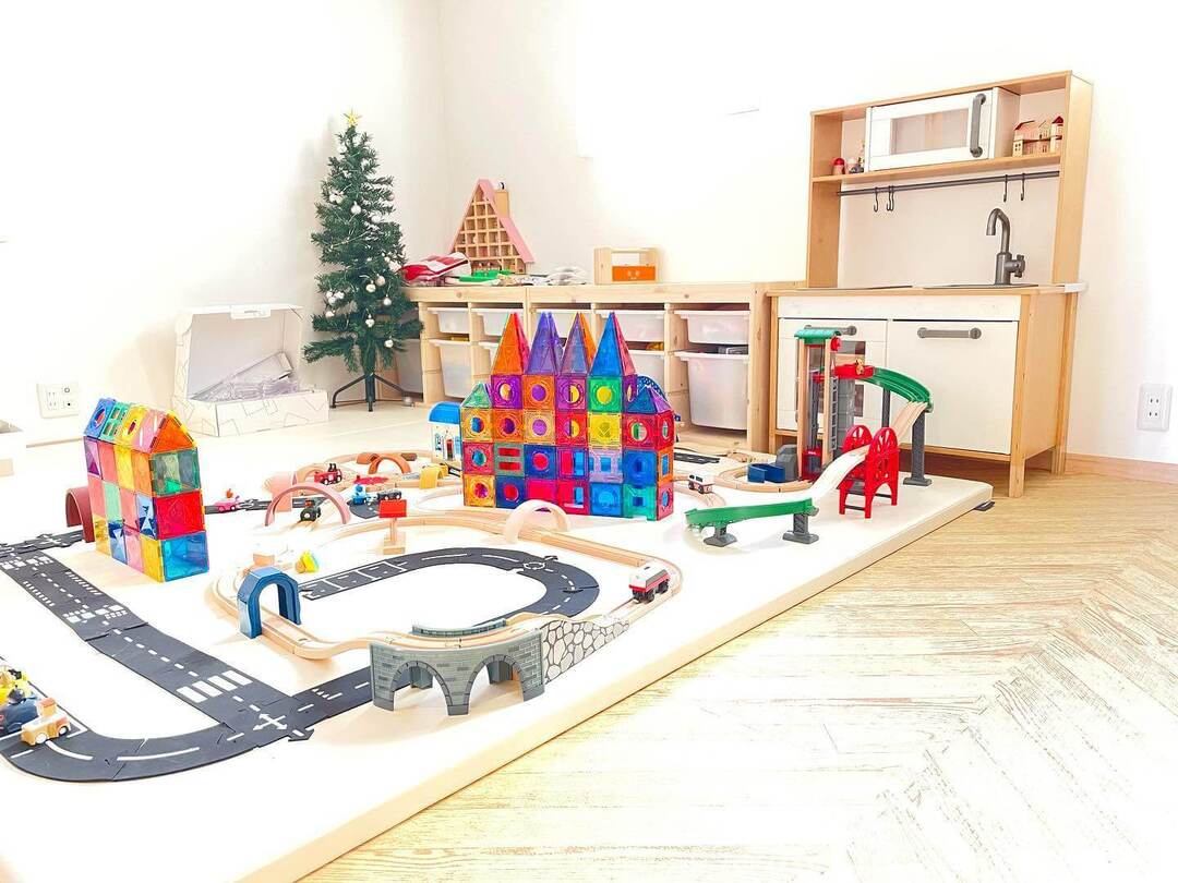 こちらはレールおもちゃで作った街にマグビルドで作ったお城や建物が出現!とってもカラフルで遊びスペースがパッと明るくなりますね。マグビルドの三角形、二等辺三角形のパーツは建物の屋根にぴったり。おうち作りにハマる子が多いようですよ。