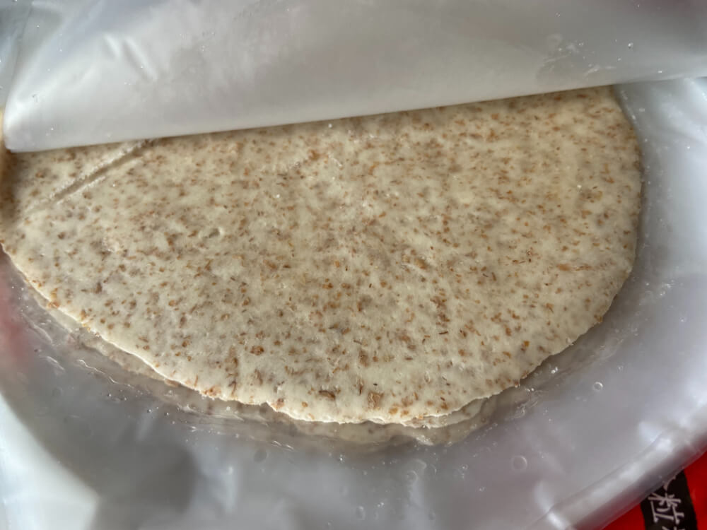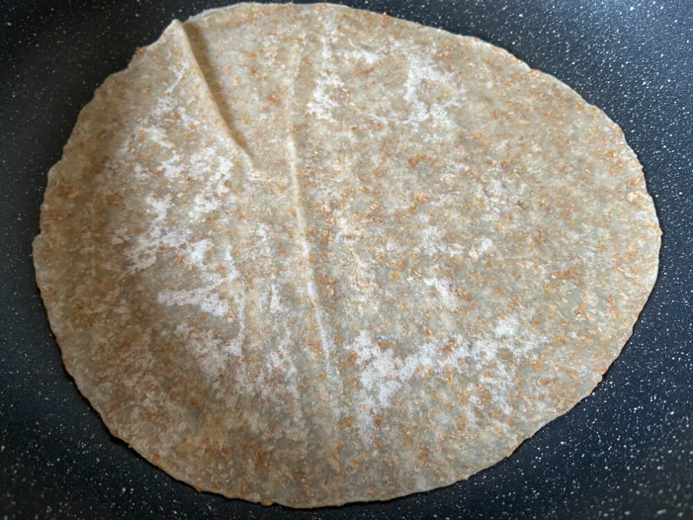台湾トルティーヤを冷凍のままフライパンに入れて弱めの中火で片面30秒、ひっくり返してまた30秒加熱して完成。あっという間にできあがりました。