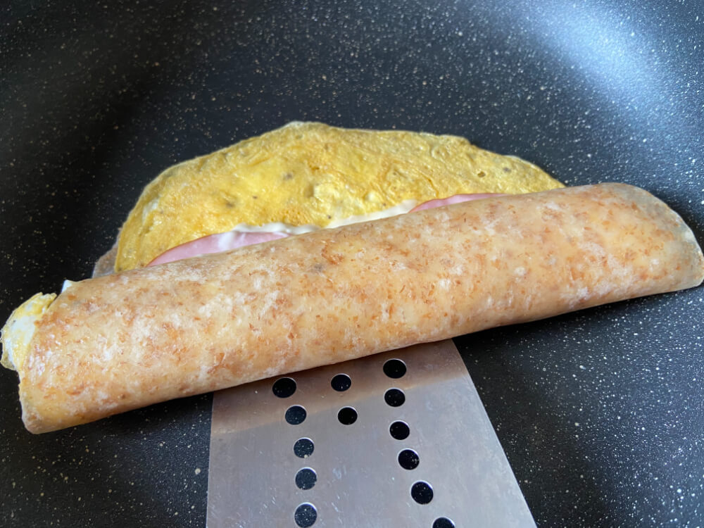 フライパンに少量の油をひいて溶きほぐした卵を流しいれて薄く焼きます。その上に加熱したトルティーヤをのせて、卵に火が入ったらひっくり返します。