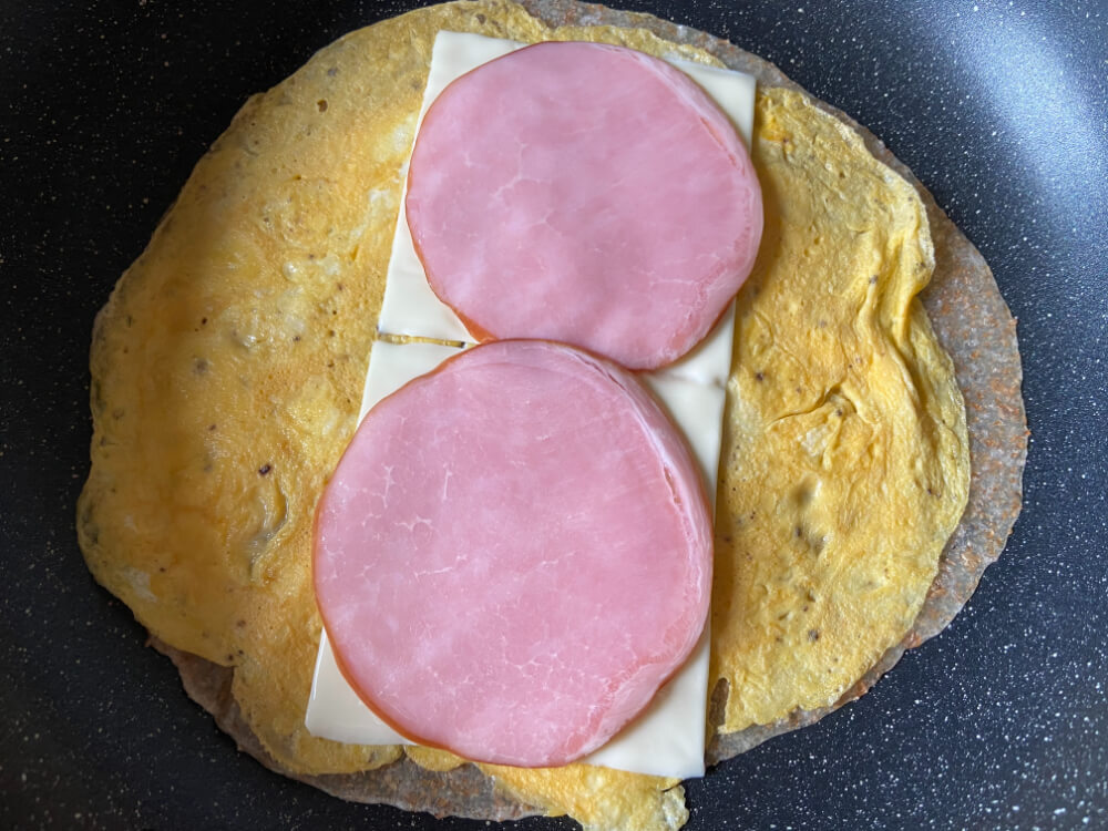トルティーヤの生地は薄いのにしっかりもちもち感があって、全粒粉の香ばしさも感じられてとってもおいしいです!ふんわり卵とハム・チーズは間違いない組み合わせ。