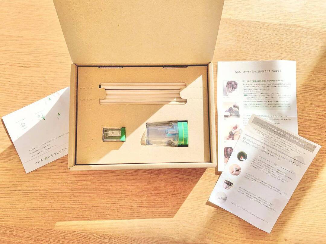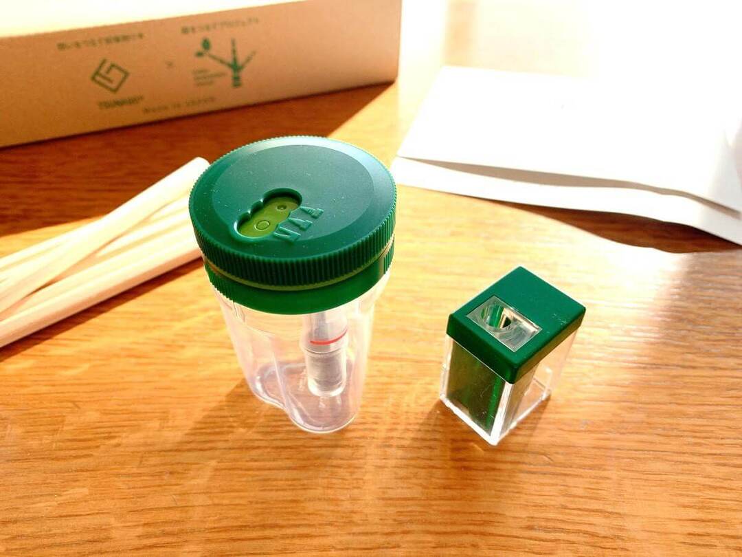 セットには間伐材からできた鉛筆と「削り具合が調節できる小さな鉛筆削り器」も。「TSUNAGO」は写真中央のやや大きな削り器です。