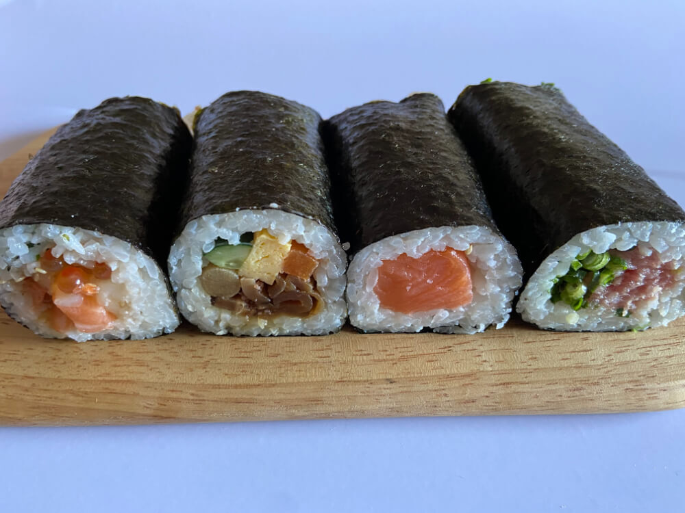 今年の恵方巻は昨年のものと同様、海鮮巻、田舎巻、サーモン巻、ネギマグロ巻の4種類。