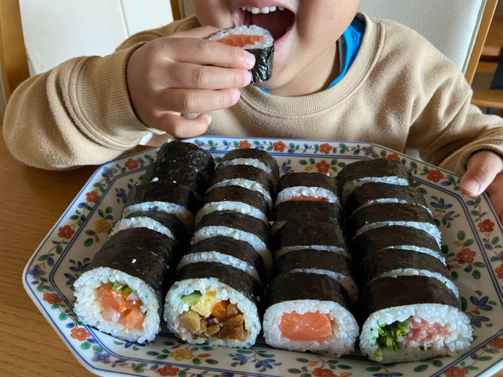 今年の方角は「南南東」。縁起のいい方角を向いてカットせずに一本を食べ切ると良いとされている恵方巻ですが、わが家は子どもが小さいので食べやすくカットして食卓に並べています。