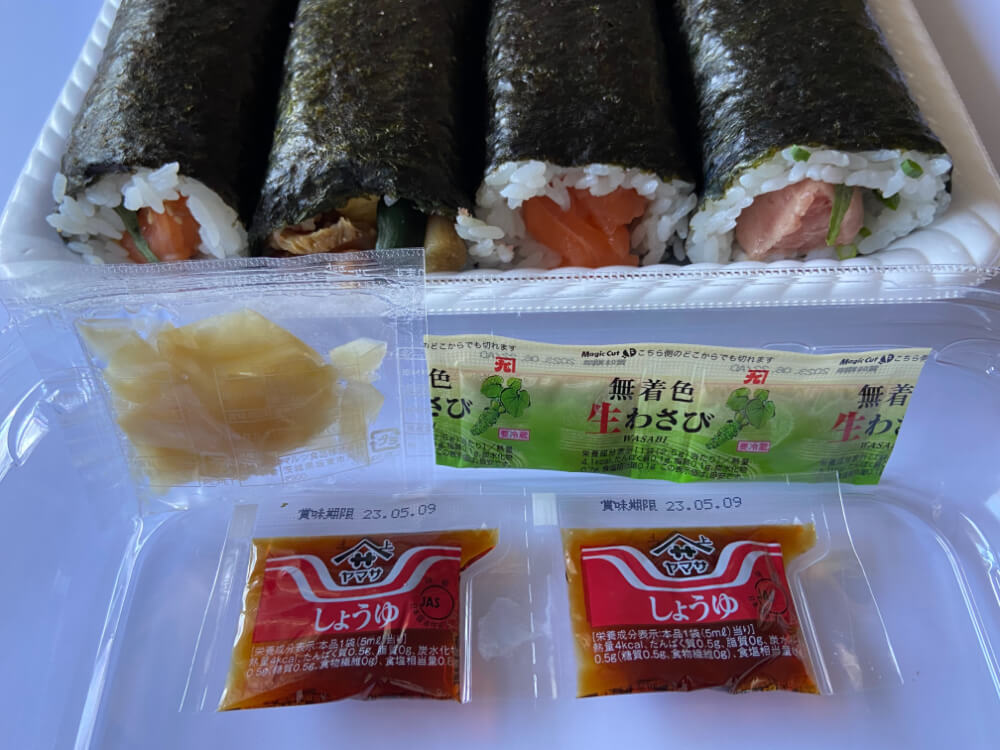 長さ約18cmの太巻きが4本。具材がたっぷり詰まって太さもありずっしりと重みのある、迫力満点のパックです。