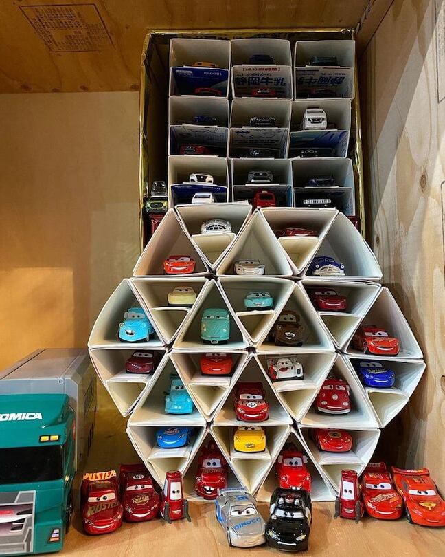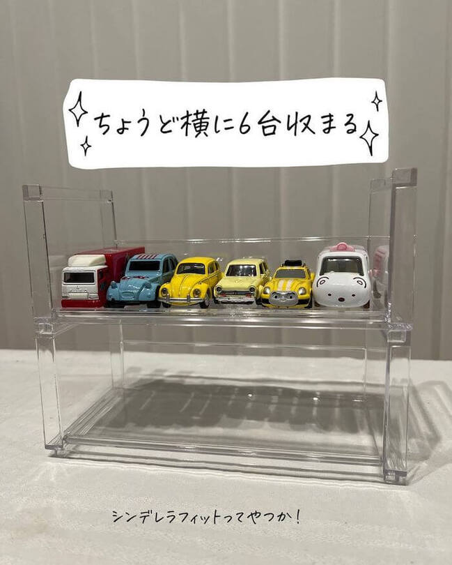そんな悩みを解決すべく、s ᴀ ᴡ ᴀさんが導入したのがセリアのSIKIRI10!仕切りのサイズがトミカにジャストフィットで気持ちいい♡