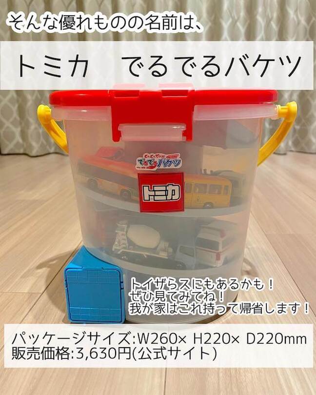 トミカがたくさん入り、持ち手もついているので移動も楽です。片付けやすくて、ママパパにとっても、子どもにとってもストレスフリーな収納方法ですね♪
