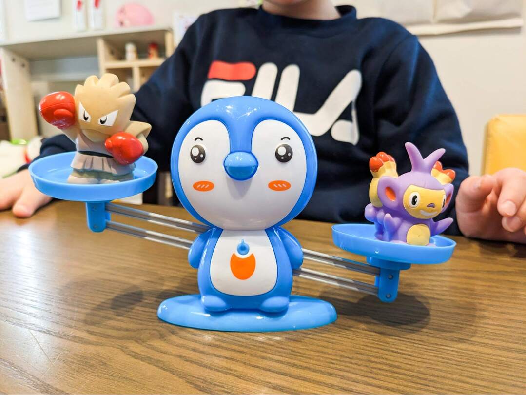 「ペンギン全部乗せても、ポケモンの方が重たいんだ!じゃあ、こっちは…」と長男が自分でいろいろ試していました。