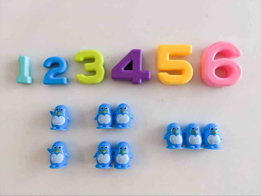 長男も「あれ?4のペンギンがいないよ?」と言い出したので、「4のペンギンはいないんだ。どれとどれを一緒に載せたら4になるかな?」とヒントを出すと、「2と2で4になる!」と合点がいった様子。6まで足し算をしながら、頑張りました!