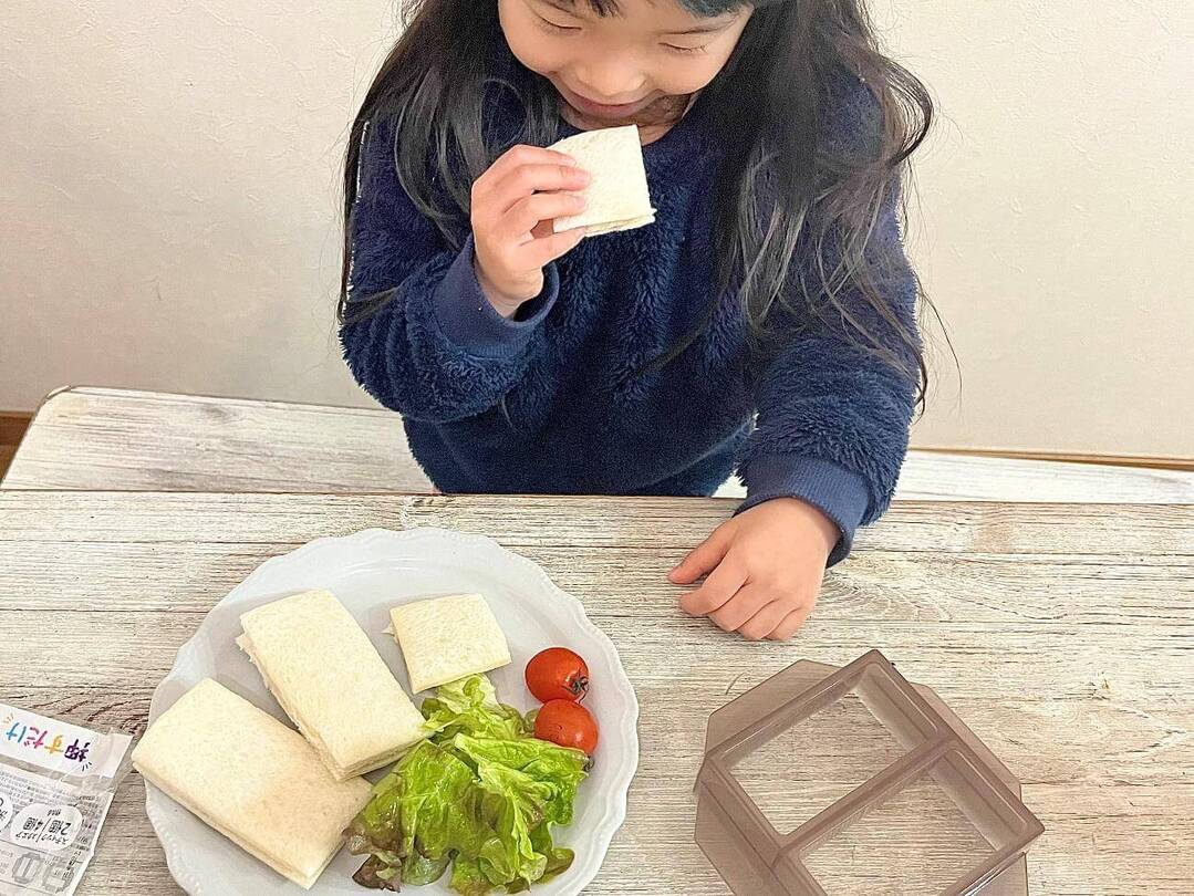 完成したミニパックサンドを娘に食べてみてもらったところ大喜び♡小さな手でもつかみやすく、パクパクと食べていましたよ。また、見栄えも良かったせいか、「おしゃれ~♡」「おいしい!」と、とっても気に入ってくれた様子。