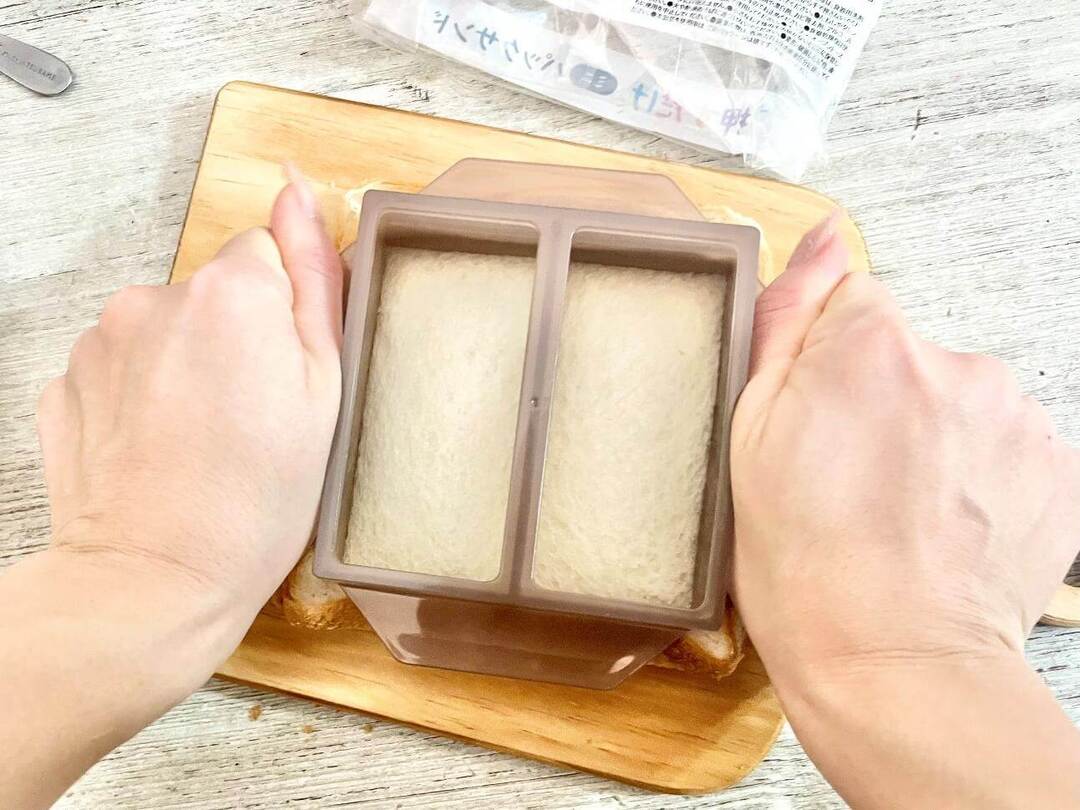 温めた食パンをもう1枚重ね、くっつけ面を下にして押しつぶし、2枚をくっつけます。その後、カット面(枠が鋭くなっている方)を食パンにギュッと当て、カットすれば完成!