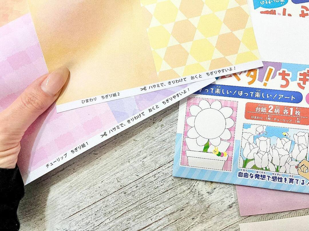 ちぎり紙は複数の柄が1枚になっているので、ちぎりやすいように柄ごとにハサミでカットしておくのがおすすめ。