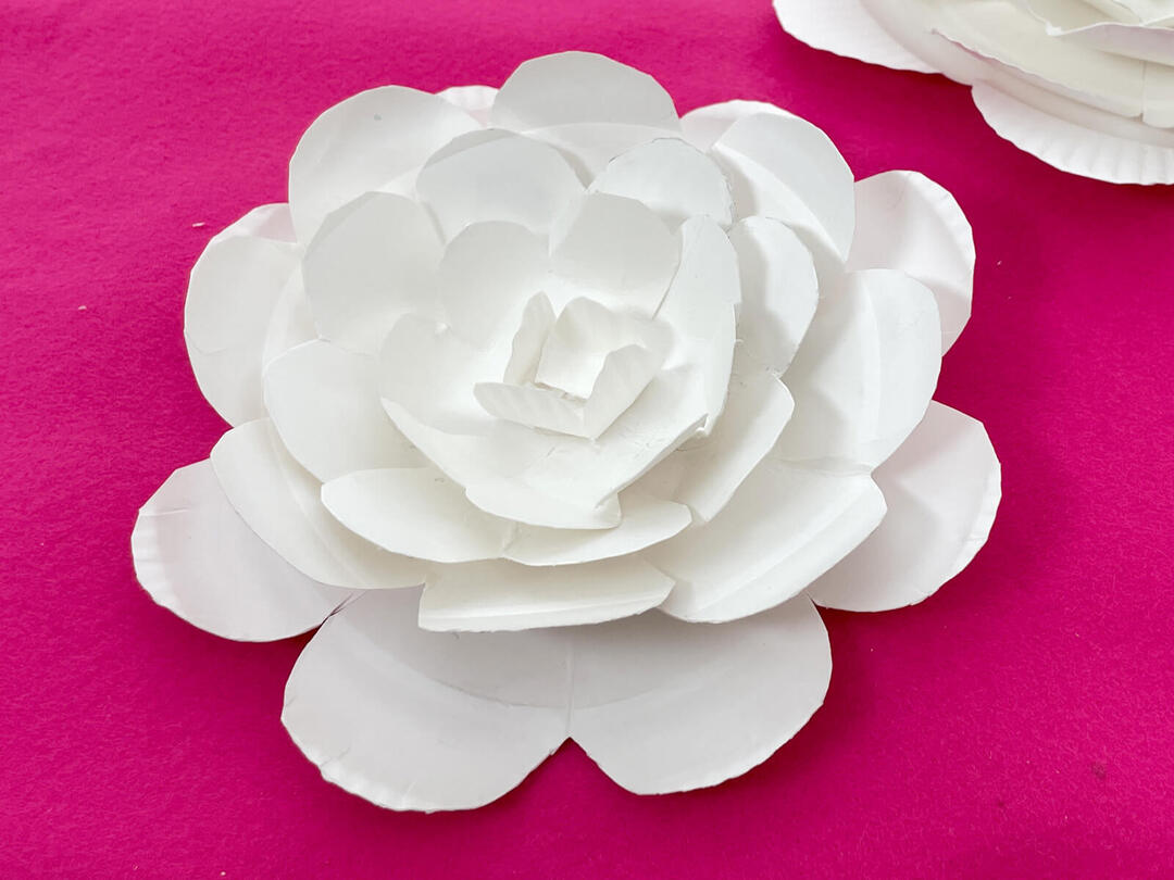 写真手前は紙皿4枚使用、奥は花びらを増やして紙皿を5枚使っています。
