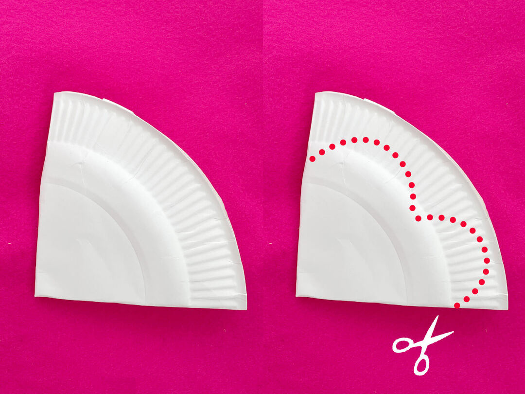 あらかじめ鉛筆などで線を書いておくと失敗なく安心です。折った紙皿は硬いのではさみで切るのに力がいります。子どもには少々難しいので、できれば大人が切ってあげてください。