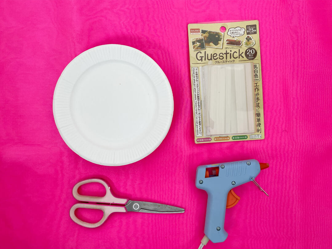 今回は100円ショップでも手に入るグルーガンを使用しましたが、木工用ボンドでもホッチキスでもOK。グルーガンは熱くなるので、小さな子どもと作るときは大人が使い、取り扱いに十分注意してくださいね。